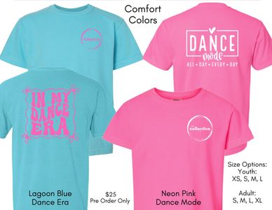 Choose from two different dance t's; Dance Era or Dance Mode. DAC logo on the left chest and dance design on the back. Available in Comfort Colors - youth and adult sizes. T's are $25 each.